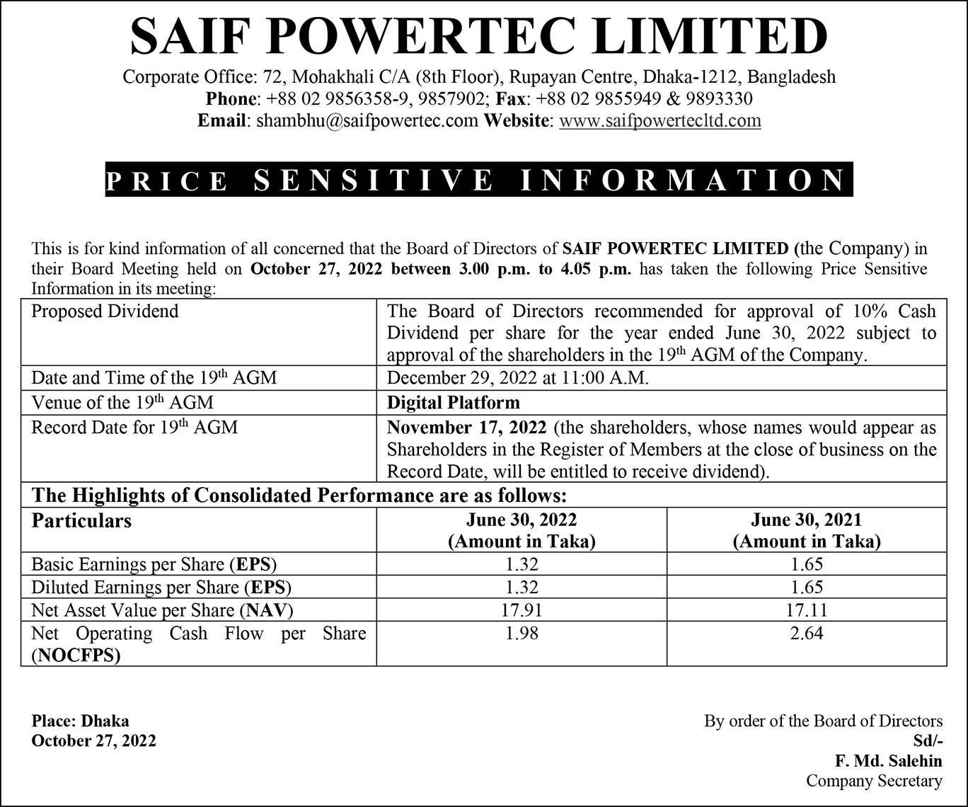 Price Sensitive Information of Saif Powertec Limited.