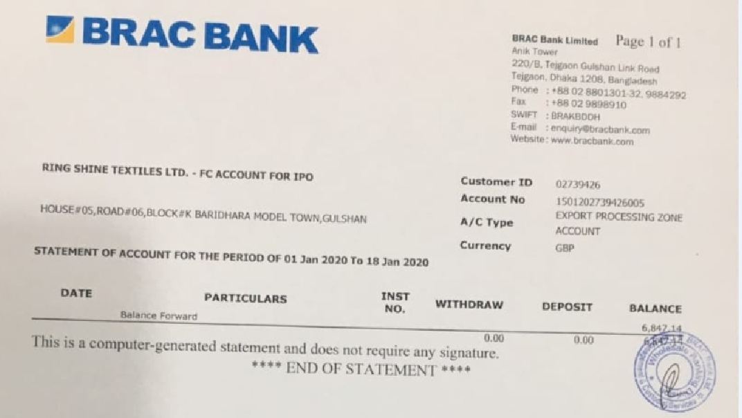 এছাড়া আইপিও খাতে প্রসপেক্টাসে উল্লেখিত ৩ কোটি ৬০ লাখ টাকা ব্যয় করেছে। যন্ত্রপাতি ও কলকব্জা ক্রয় সংক্রান্ত প্রজেক্টের জন্য যে অর্থ বরাদ্দ রয়েছে তা কোম্পানির ব্যাংক অ্যাকাউন্টেই রয়েছে। এই আইপিও অর্থ ব্যবহারের সময়সীমা ২০২১ সালের ৫ এপ্রিল। এ সময়ের মধ্যে আইপিও থেকে উত্তোলিত অর্থের সম্পূর্ণ ব্যবহার করবে রিং সাইন টেক্সটাইল। রিং সাইনের আইপিওর সম্পূর্ণ অর্থ ব্র্যাক ব্যাংকের অ্যাকাউন্টে রয়েছে।