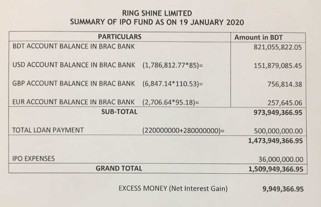 তথ্যানুসন্ধানে জানা যায়, যন্ত্রপাতি ক্রয়, ব্যাংক ঋণ পরিশোধ এবং আইপিও খাতে ব্যয়ের উদ্দেশ্যে পুঁজিবাজার থেকে আইপিওর মাধ্যমে ১৫০ কোটি টাকা উত্তোলন করে রিং সাইন টেক্সটাইল। ইতিমধ্যে কোম্পানিটি প্রসপেক্টাসে উল্লেখিত ব্যাংক ঋণের ৫০ কোটি টাকা সম্পূর্ণ পরিশোধ করেছে।