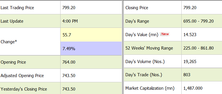 ডিএসই’র তথ্য পর্যালোচনায় দেখা গেছে, গত ১৮ জুলাই কোম্পানিটির শেয়ার দর ছিল ২৯৩.৬০ টাকা। যা পরবর্তী ছয় কার্যদিবসে তা ৪৮৫.১০ টাকায় ওঠে আসে। আলোচ্য সময়ে কোম্পানিটির শেয়ার দর ১৯১.৫০ টাকা বা ৬৫ শতাংশ বেড়েছে। পরবর্তীতে দর বাড়ার কারণ জানতে চেয়ে কোম্পানিটিকে চিঠি পাঠায় ডিএসই। জবাবে কোম্পানিটিও মূল্য সংবেদনশীল তথ্য নেই বলে নিজেদের দায় সাড়ে। অথচ এরপরও কোম্পানিটির দর বাড়ার বিষয়টি থেমে থাকে নি। বরং পরবর্তী ৬ কার্যদিবসে তা আরও ২০৮.৭০ টাকা বেড়ে গতকাল ৬৯৩.৮০ টাকায় উঠে আসে। এর পর দর বাড়তে বাড়তে কোম্পানি গত মঙ্গলবার ৮শত ঘরে ছুই ছুই।