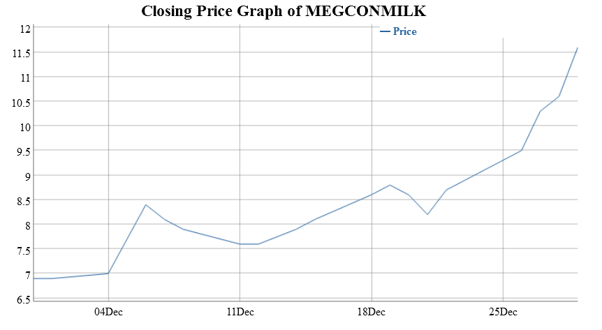 বাজার পর্যবেক্ষণে দেখা যায়, ডিএসইতে এক মাসে মেঘনা কনডেন্সড মিল্কের শেয়ারদর বেড়েছে ৫৩ দশমিক ৭৩ শতাংশ। ২৪ নভেম্বর কোম্পানিটির শেয়ারদর ছিল ৬ টাকা ৭০ পয়সা। ২৭ ডিসেম্বর তা ১০ টাকা ৩০ পয়সায় উন্নীত হয়।