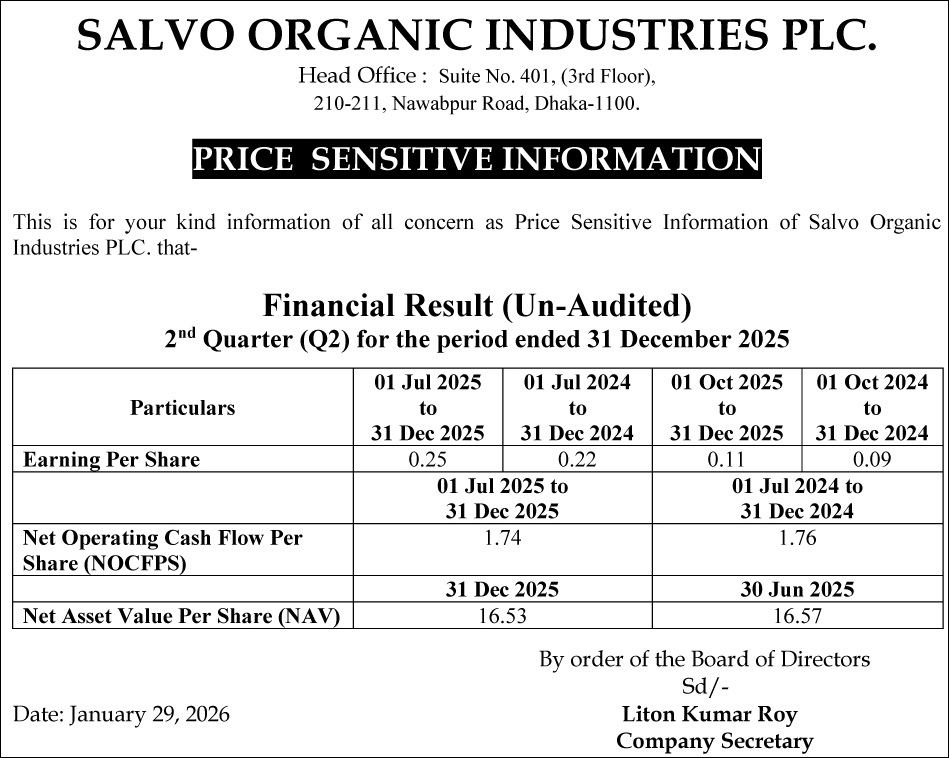 Price Sensitive Information of Salvo Organic Industries PLC.